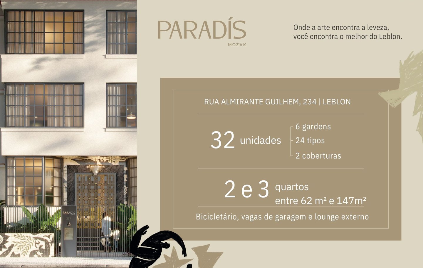 Viver no Paradís Mozak é escolher um lifestyle vibrante e, ao mesmo tempo, desfrutar da tranquilidade de um lar impecável. É a oportunidade de realizar o sonho de morar no Leblon, em um empreendimento que é uma verdadeira obra de arte, pensado para aqueles que buscam exclusividade, conforto e uma conexão genuína com a alma carioca. Não perca a chance de descobrir o seu paraíso particular neste lançamento exclusivo.