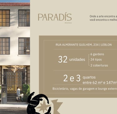 Descubra a oportunidade única de viver o melhor do Leblon em um endereço que redefine sofisticação e bem-estar. O Paradís Mozak oferece apartamentos de 2 e 3 quartos, projetados para quem busca exclusividade, conforto e a vibrante atmosfera de um dos bairros mais desejados do Rio.
